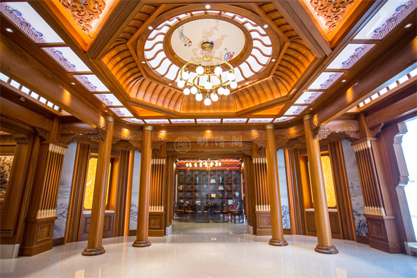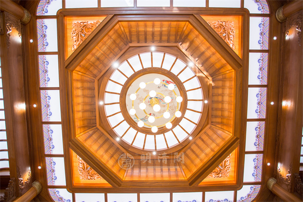 明清閣該案例藻井穹頂如傘蓋隆起,榫卯精工構(gòu)筑,無需一釘而穩(wěn)如磐石。木質(zhì)的框架結(jié)構(gòu)搭配細(xì)膩的雕刻與彩繪,每一格中都蘊(yùn)含著中式傳統(tǒng)圖案的韻味,在燈光的映照下,更顯金碧輝煌,為整個(gè)空間增添了一抹大氣與莊重。其形上圓下方,合"天圓地方"之道,非惟裝飾,更乃禮制象征,唯皇家與敕建寺觀可享,彰顯封建等級(jí)之尊。
